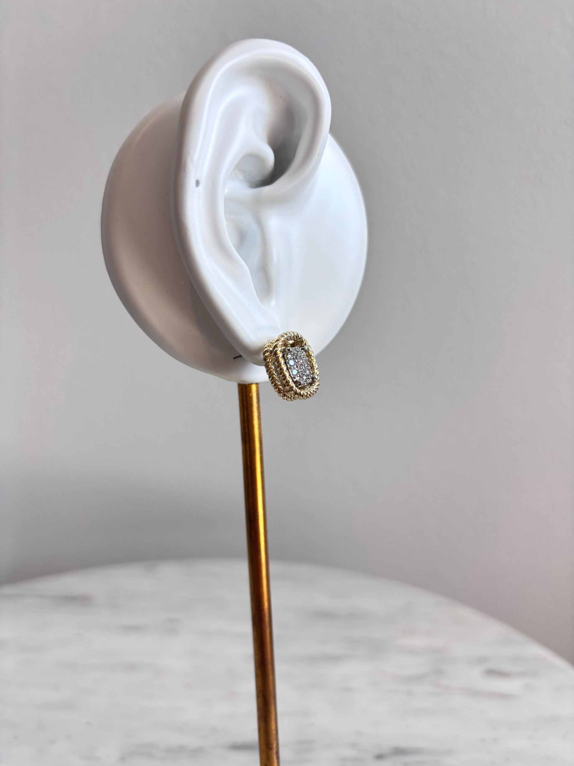 The Fe Squircle Twisted Double Line CZ Post Earrings feature a trendy squircle shape adorned with paved CZ, creating a refined and versatile look perfect for any occasion.