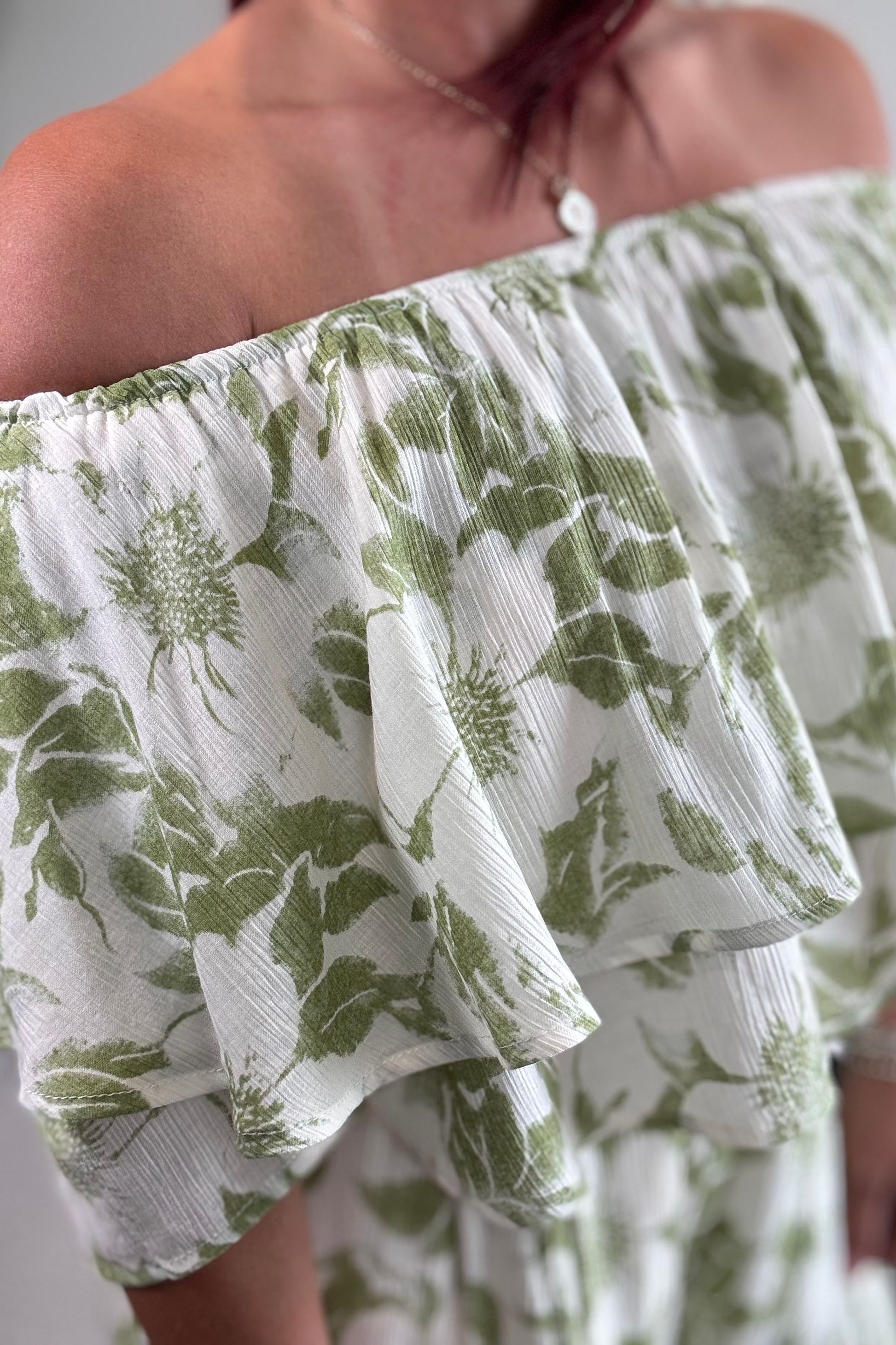 Su diseño off-shoulder con capas aporta feminidad y movimiento, mientras el pantalón wide-leg crea una silueta fluida y favorecedora. El estampado floral eleva el look con carácter y sofisticación, manteniéndose elegante y equilibrado. Es un set que puedes usar junto o por separado, permitiéndote sacarle el máximo provecho y adaptarlo a diferentes ocasiones.