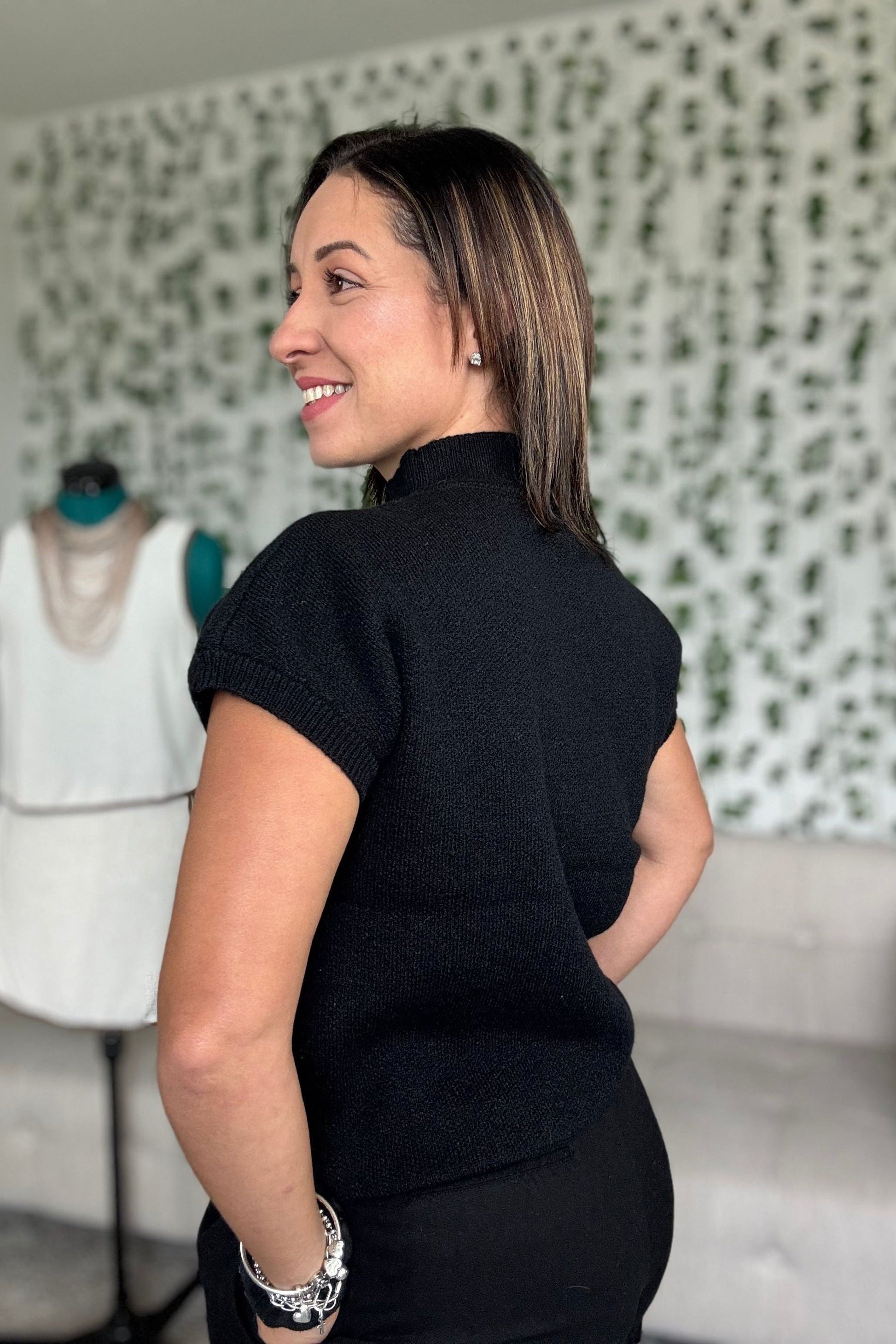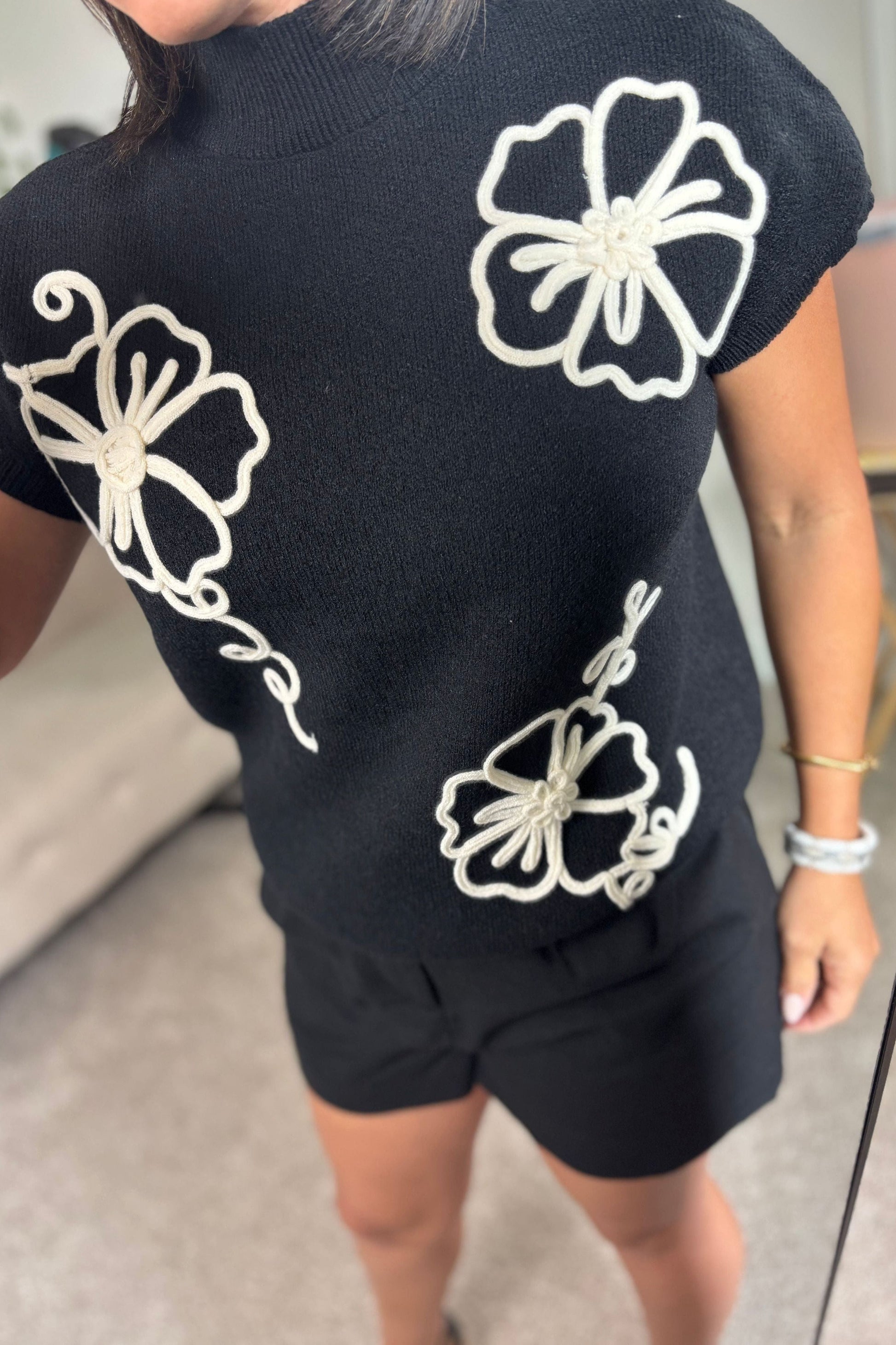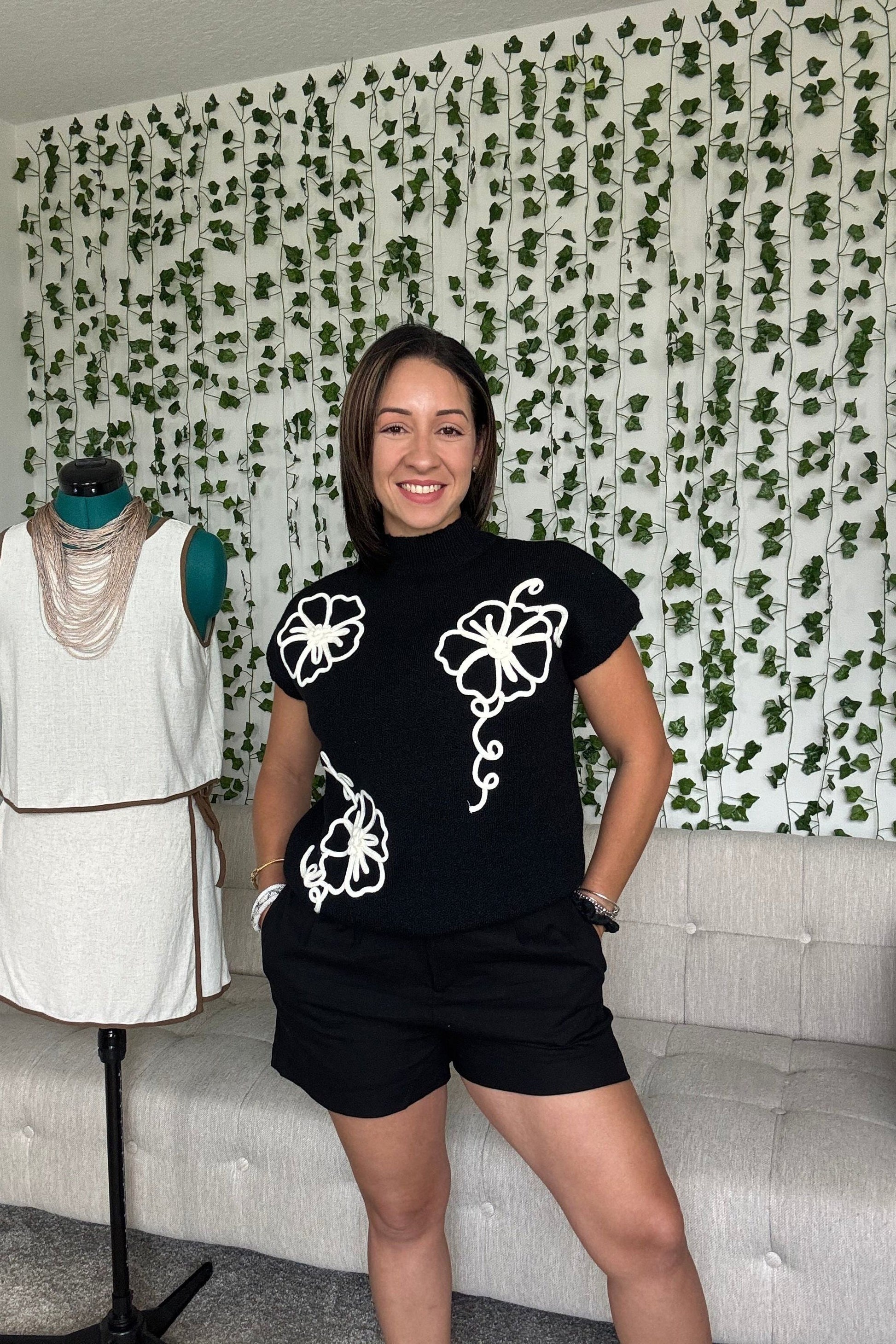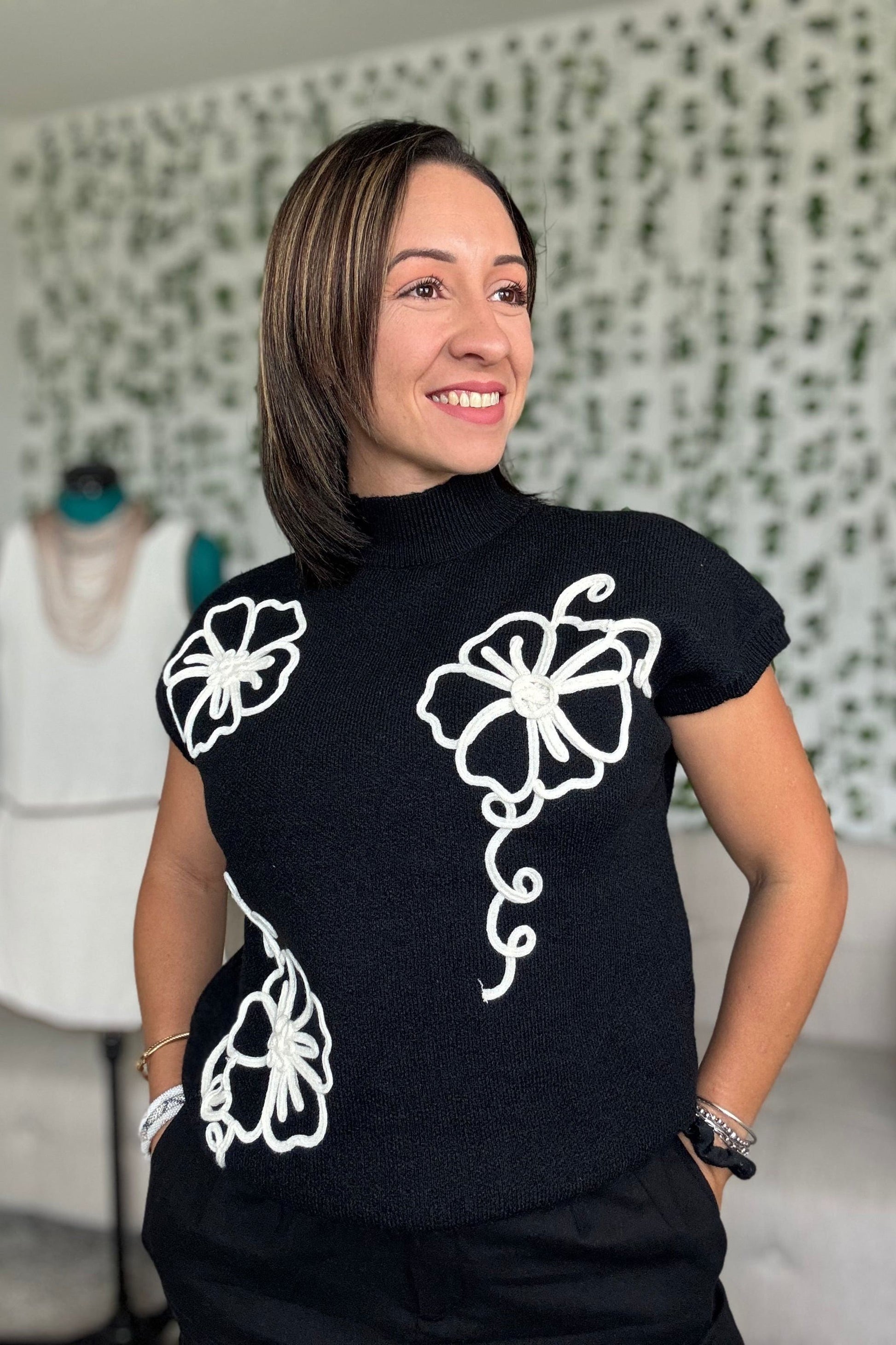 This elegant black sweater features a delicate floral trim that adds a touch of sophistication to your look. Its short sleeves and mock neckline create a refined silhouette perfect for both casual and dressy occasions. Comfortable and stylish, this sweater effortlessly elevates your wardrobe with subtle charm.