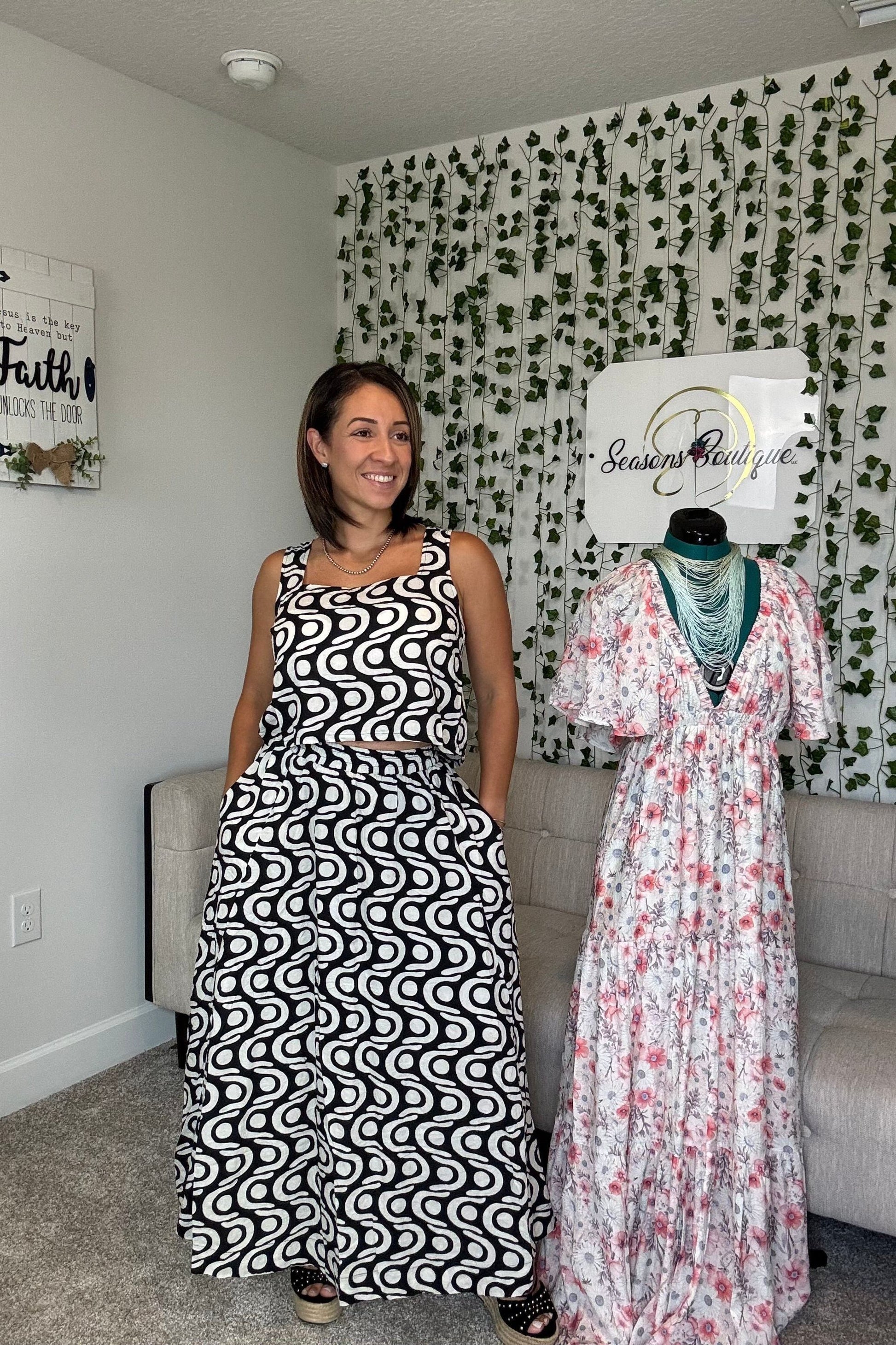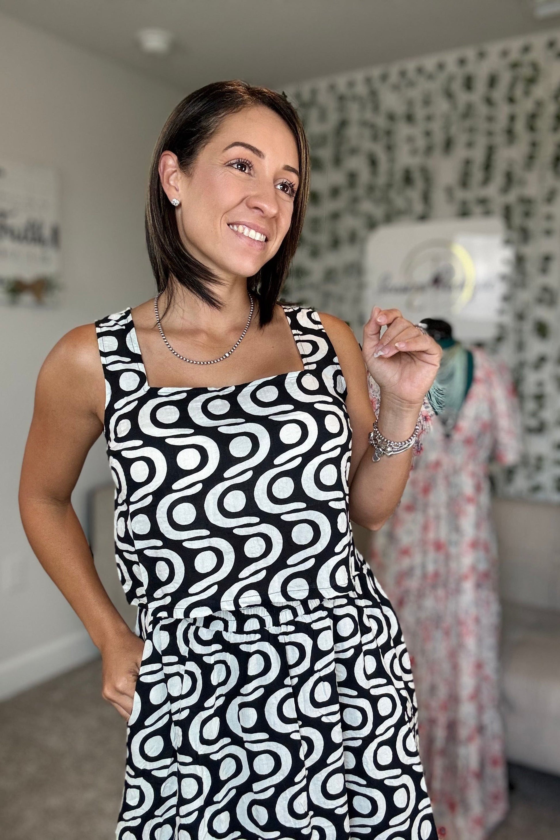 Elevate your wardrobe with this stunning geometric top and skirt set. Featuring a fresh, elegant design, this timeless duo combines modern prints with classic silhouettes for a look that never goes out of style. Perfect for any occasion, the crop top and skirt complement each other beautifully, offering a chic and confident outfit that feels both comfortable and sophisticated. Make a lasting impression with this versatile set that effortlessly blends bold patterns and refined elegance.