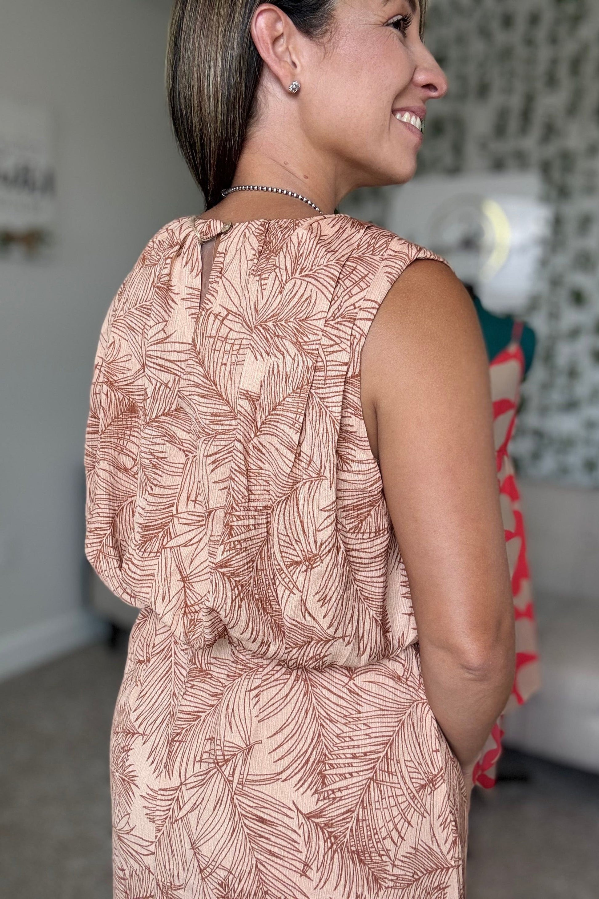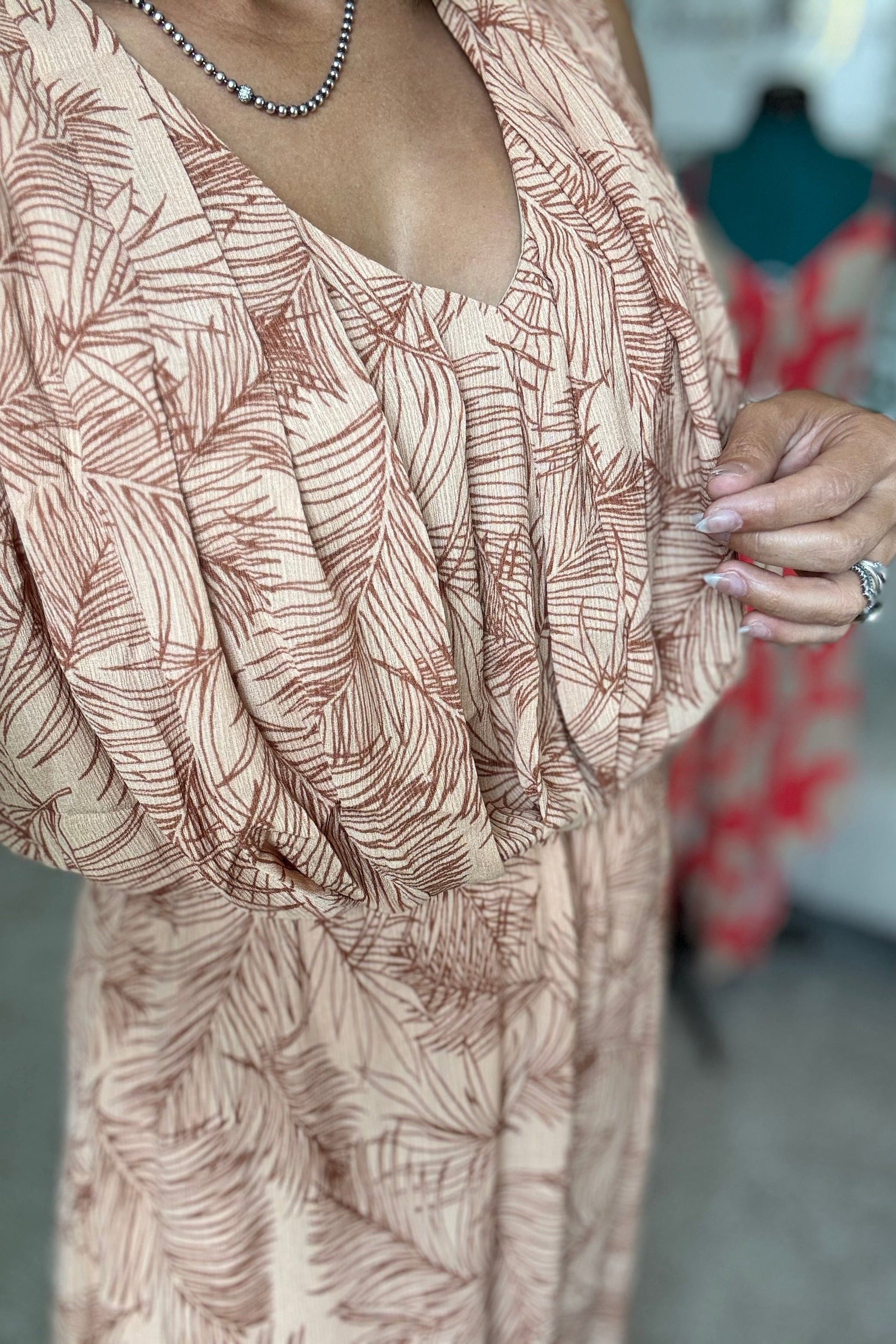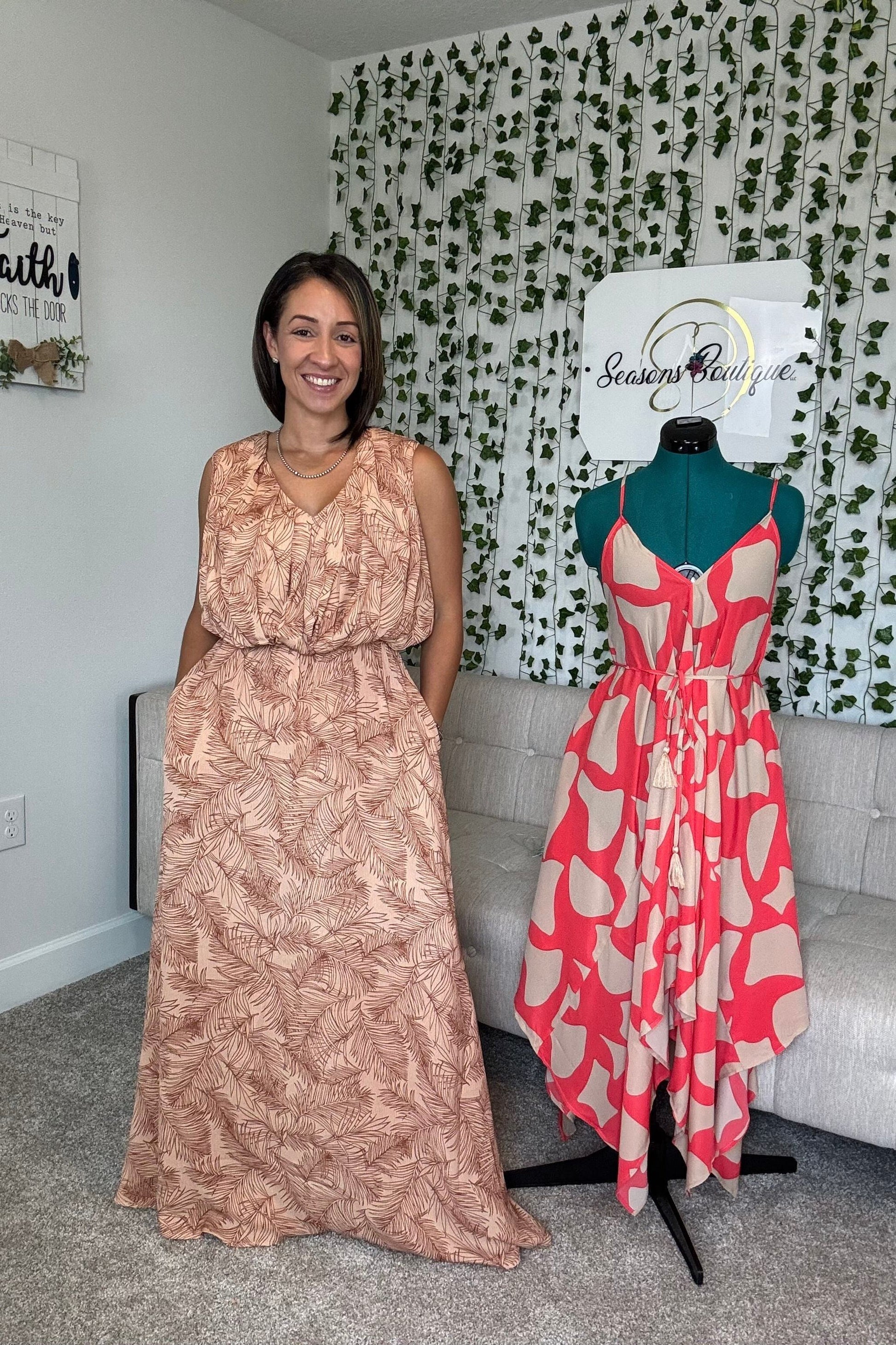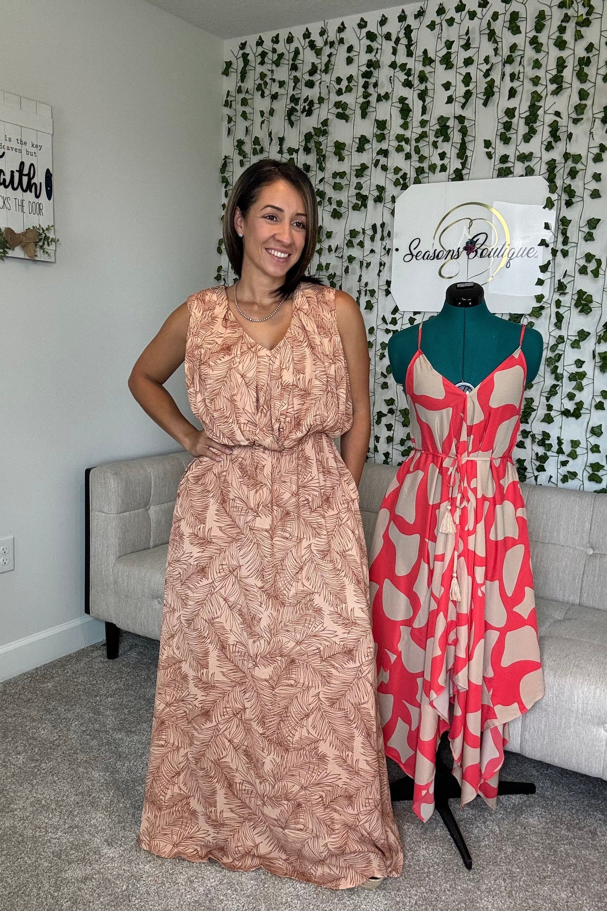 This elegant maxi dress features a delicate leaf print in a soothing latte color, combining natural beauty with refined style. Designed with practical pockets, it offers both sophistication and convenience, making it an ideal choice for effortless daytime or evening wear. The flowing silhouette enhances comfort while maintaining a polished look.