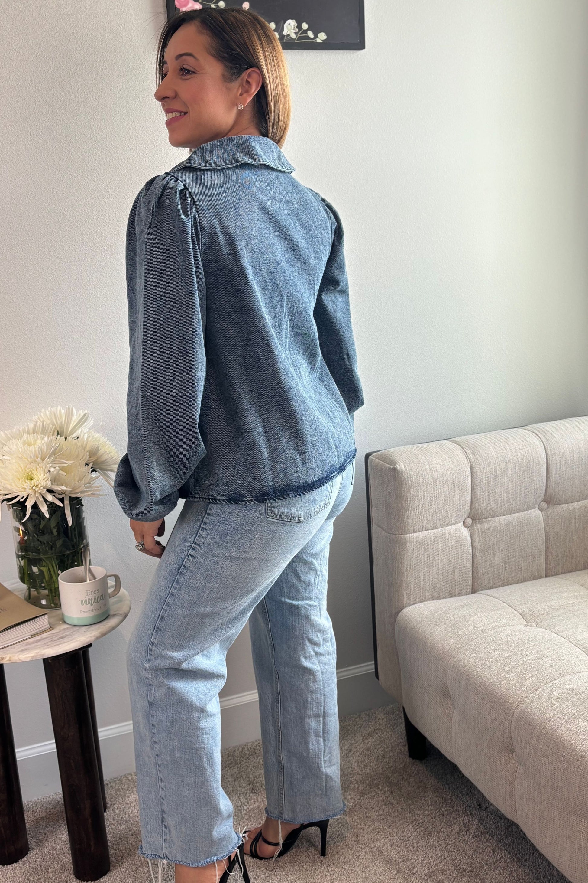 This long-sleeve denim top is more than just clothing — it’s an extension of who you are. With its unique collar and refined design, it brings a subtle touch of elegance and authenticity, highlighting your essence without saying too much.