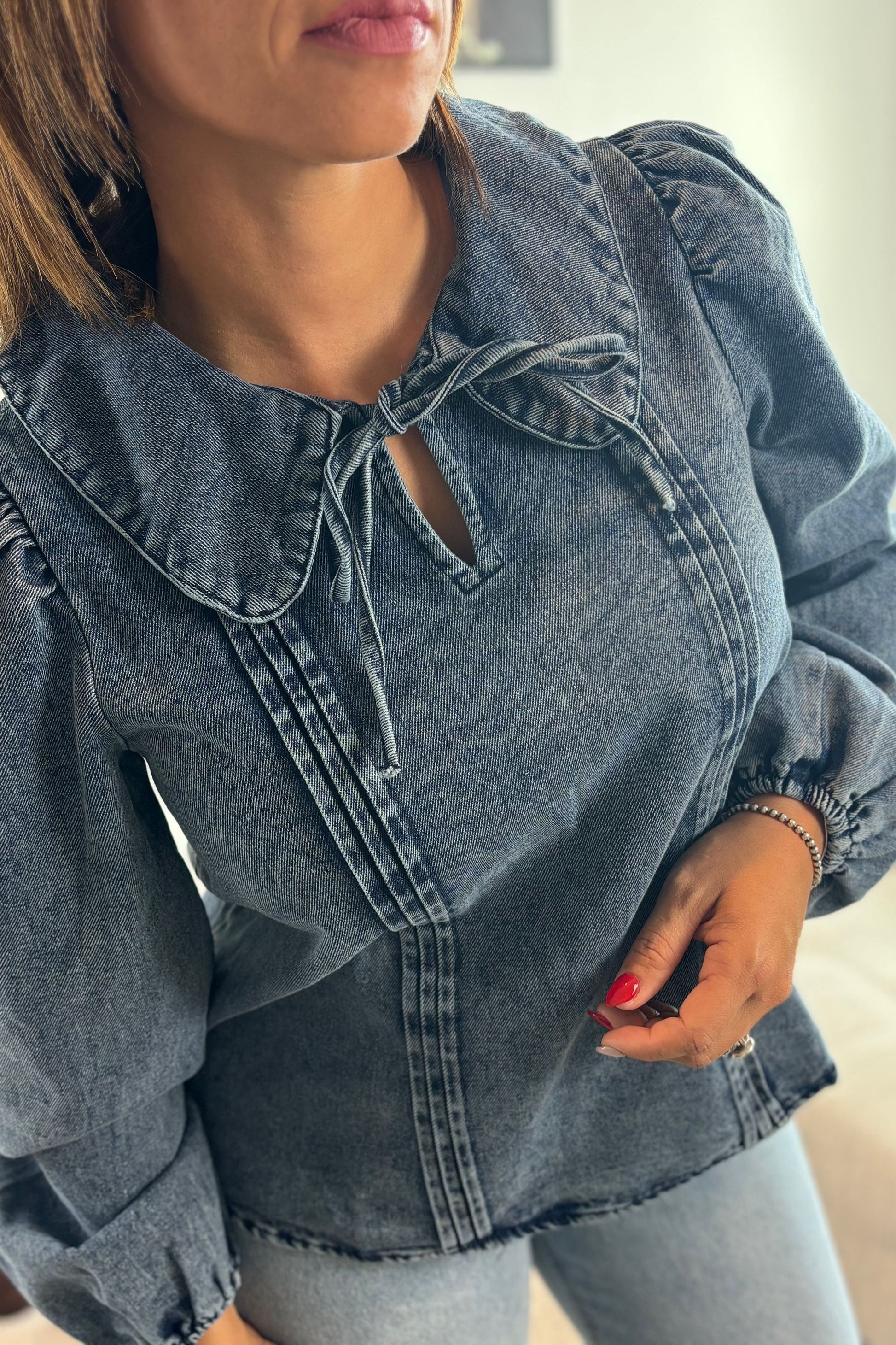 LONG SLEEVE FRONT BOW TIE DENIM TOP
