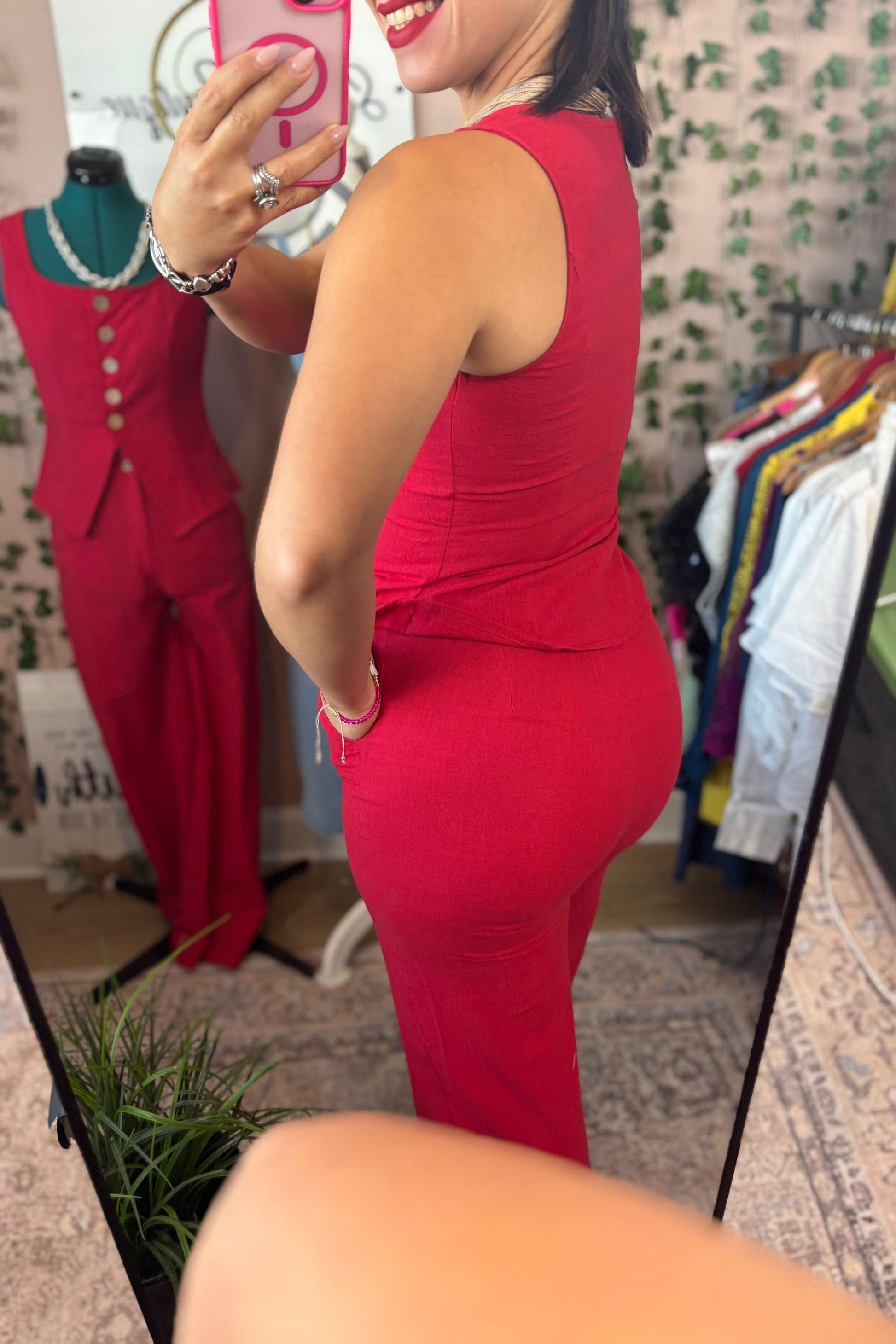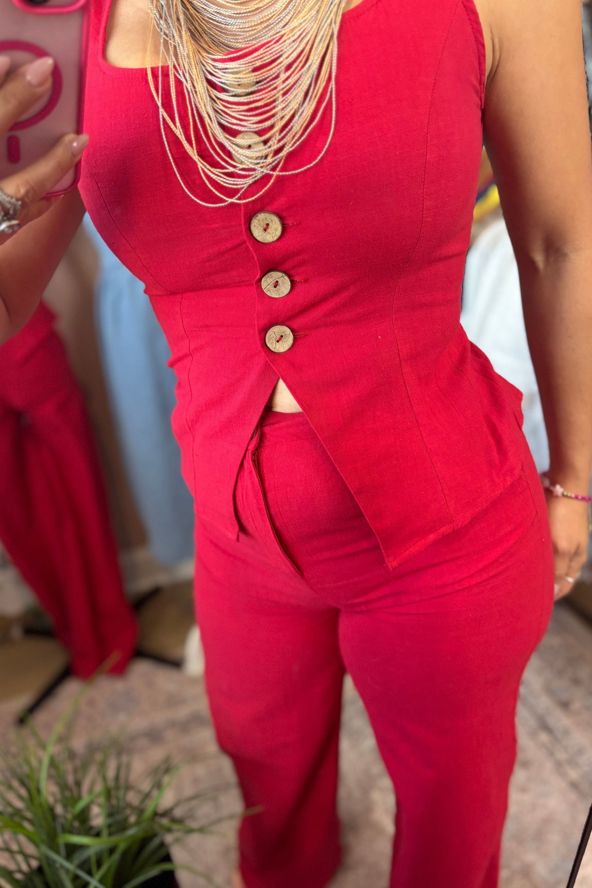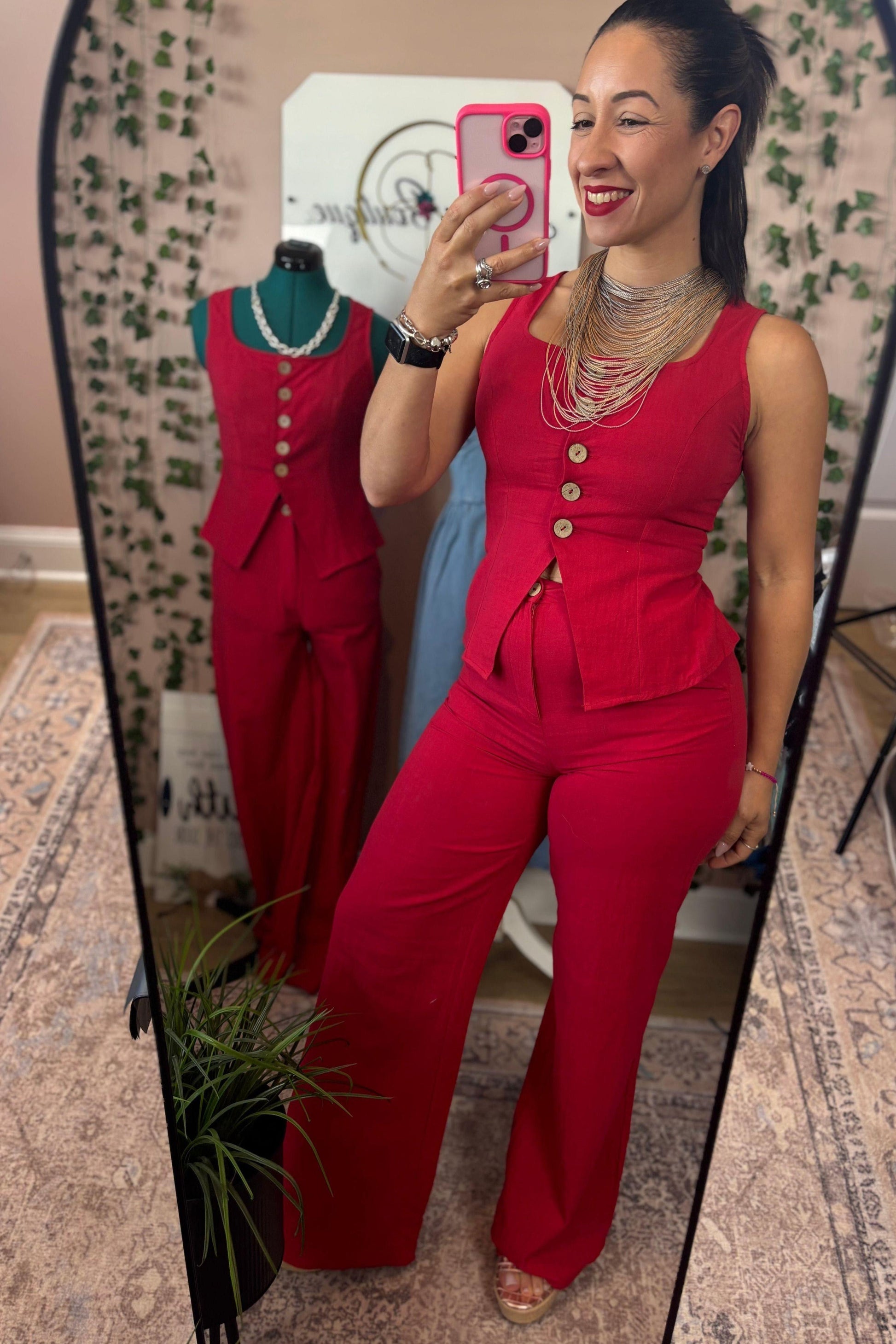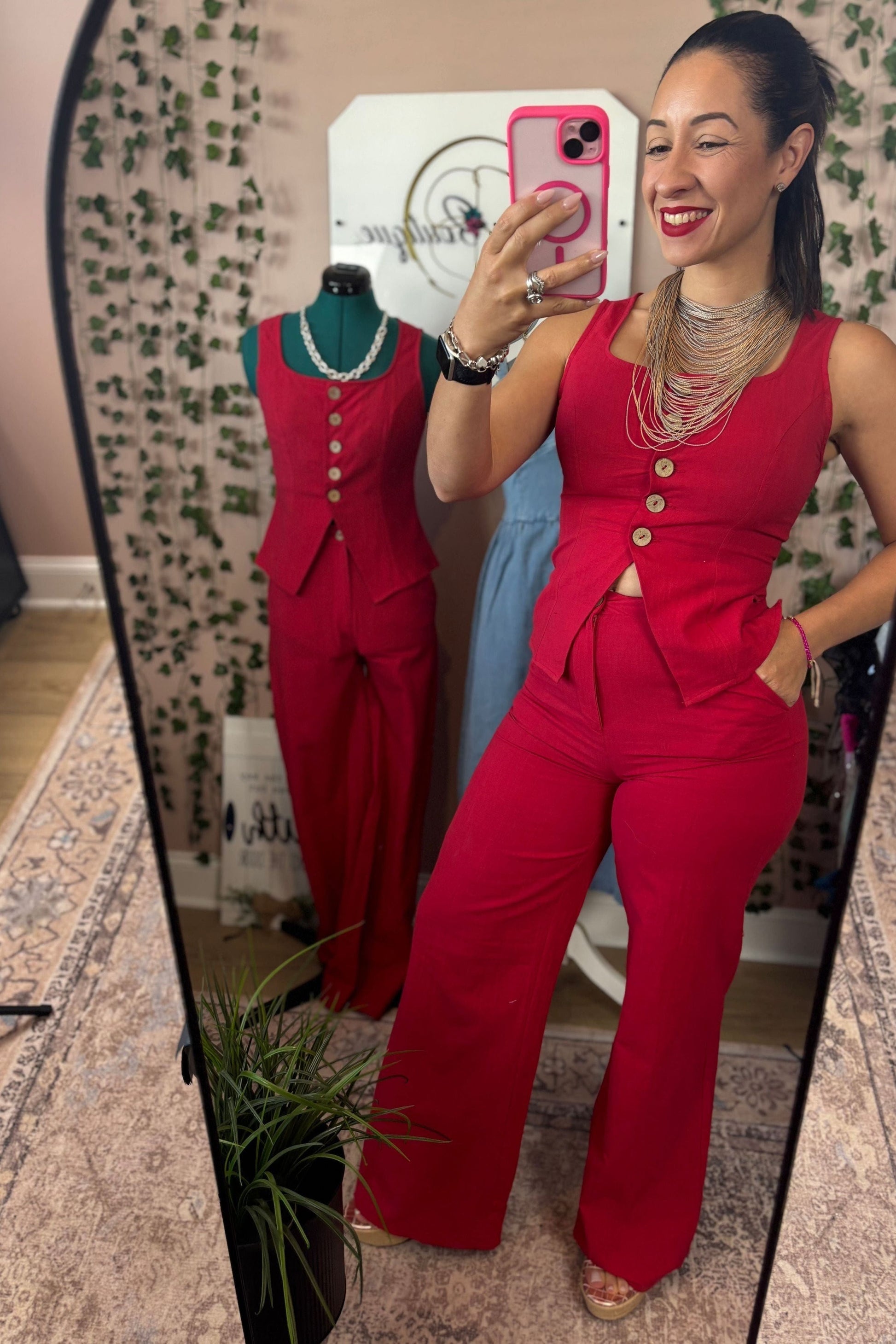 Enhance your wardrobe with this elegant and sophisticated red vest and pants set. Featuring beautiful wood buttons, the set exudes a timeless charm. Perfect for any occasion, this set will make you stand out in style and bring a touch of luxury to any ensemble.
