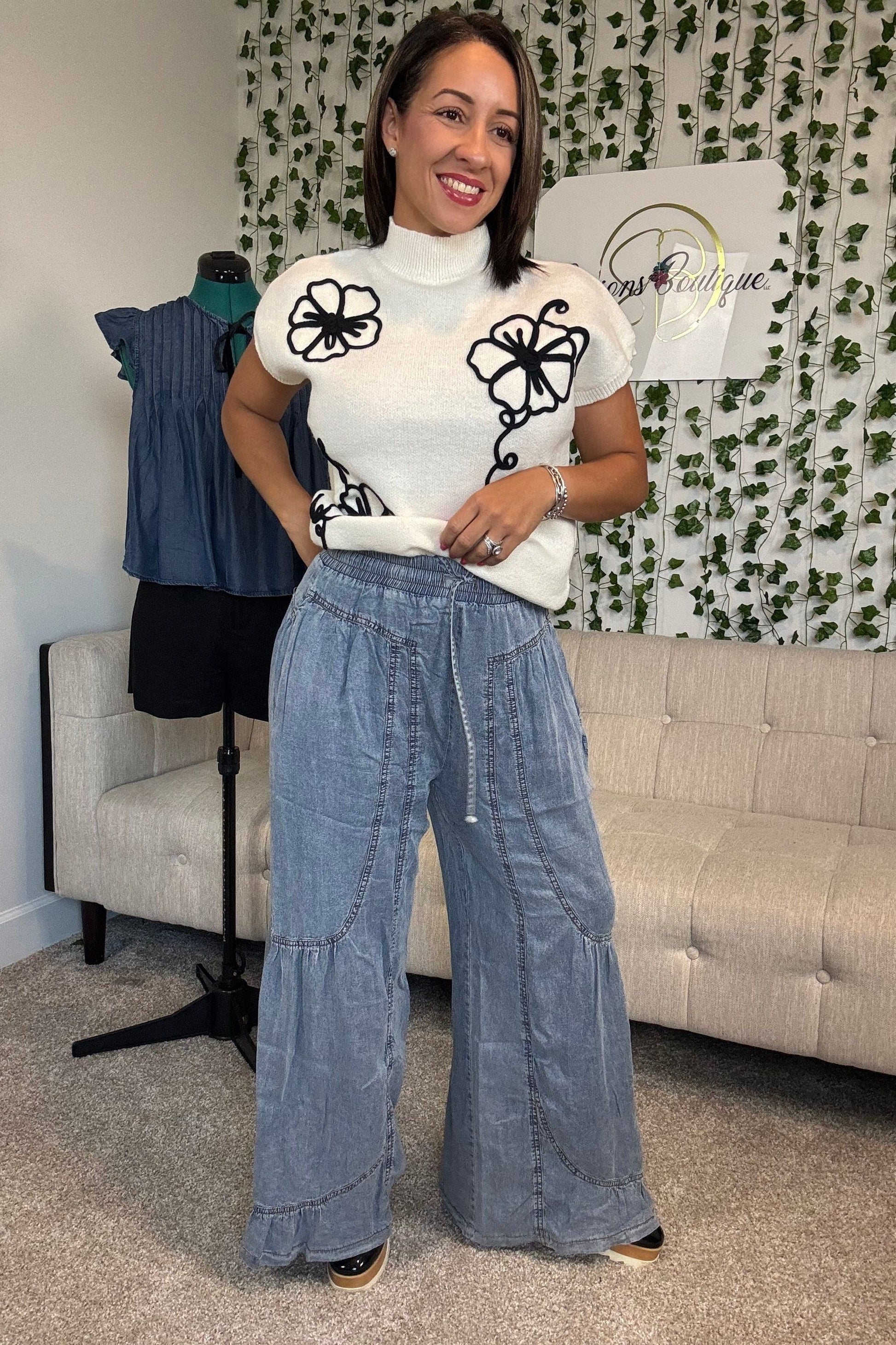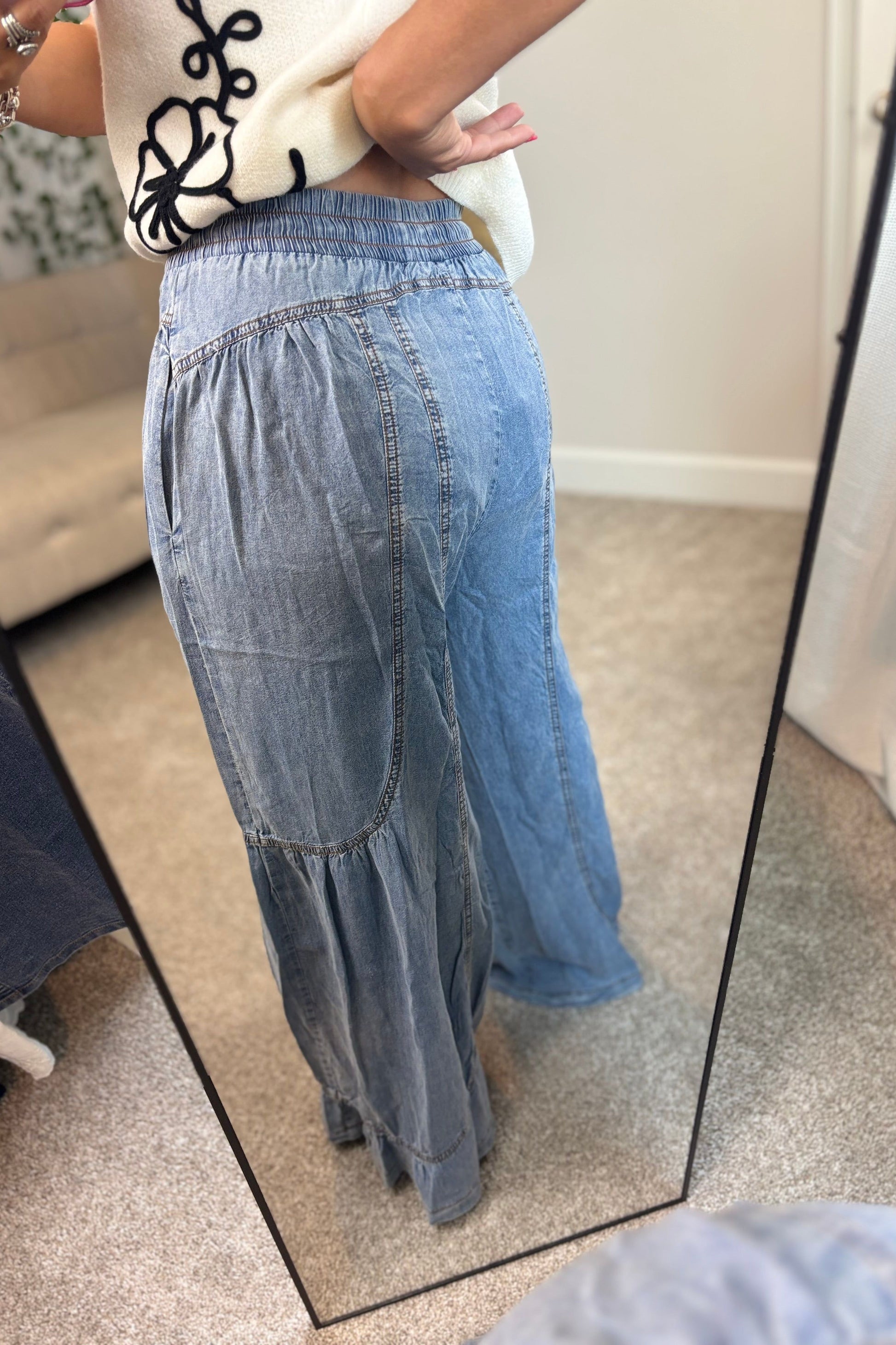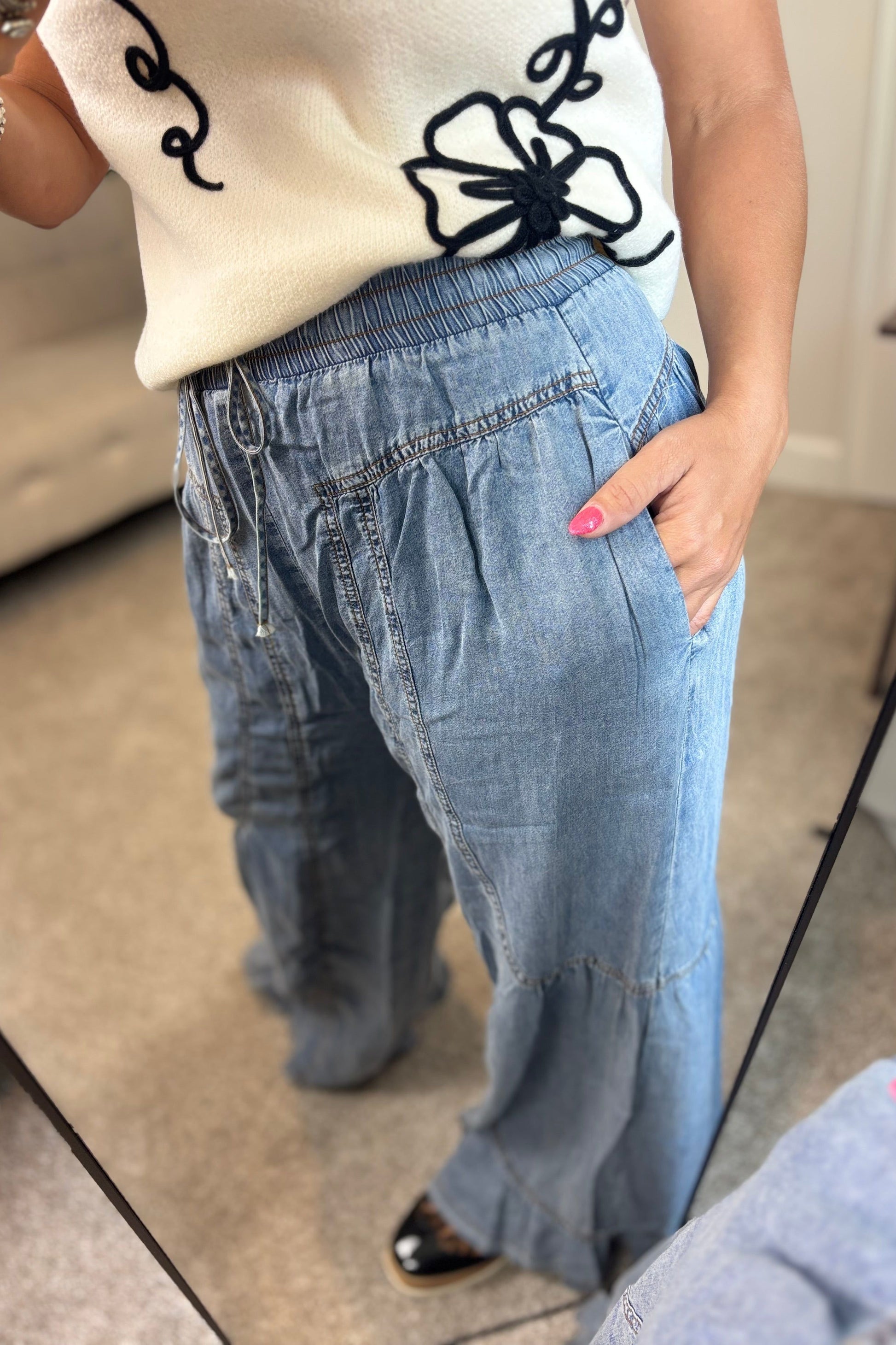Experience effortless style and comfort with these wide leg palazzo pants. Crafted from mineral-washed chambray, they offer a soft, lived-in feel and a relaxed drape. The elastic waistband ensures a perfect fit, while the wide leg design provides freedom of movement and a flattering silhouette. Ideal for casual outings or dressing up, these pants combine versatility with breathable comfort.