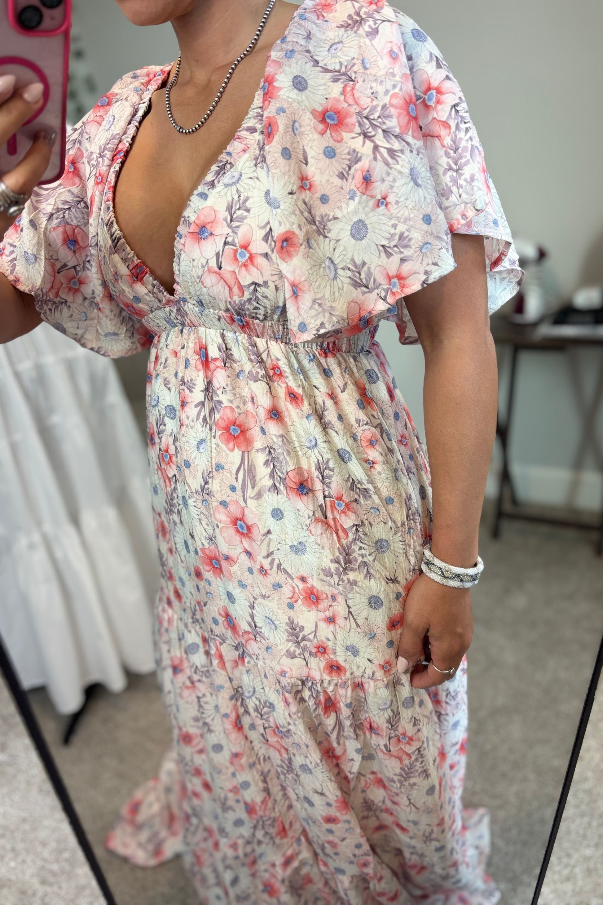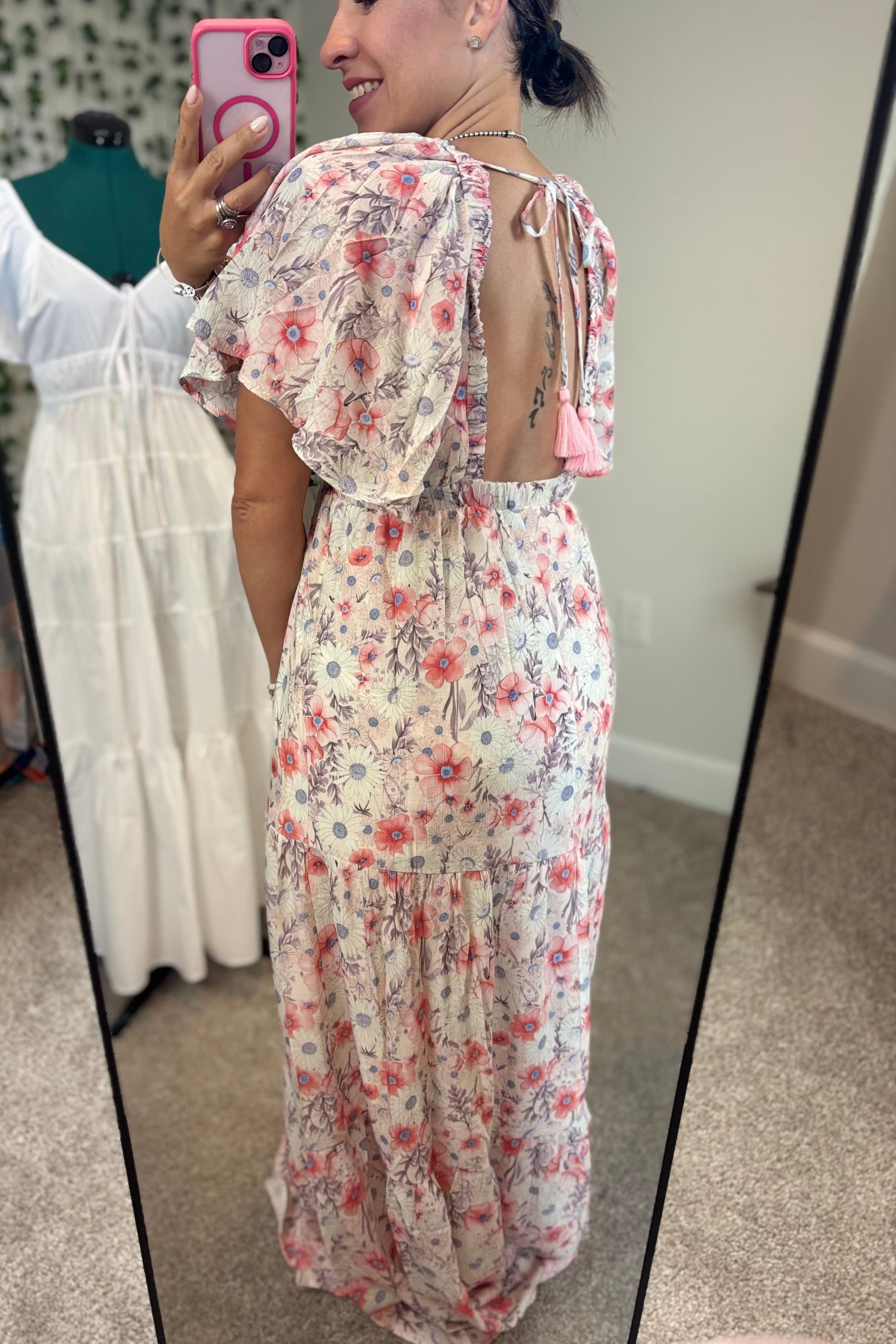 Elevate your summer style with our V-NECK FLORAL MAXI DRESS! Soft colors and a beautiful floral print make this dress a must-have for your wardrobe. The v-neck and open back add a touch of hotel-style sophistication. Perfect for long summer days and nights, our dress will have you feeling confident and elegant. Order now and step into effortless summer style!